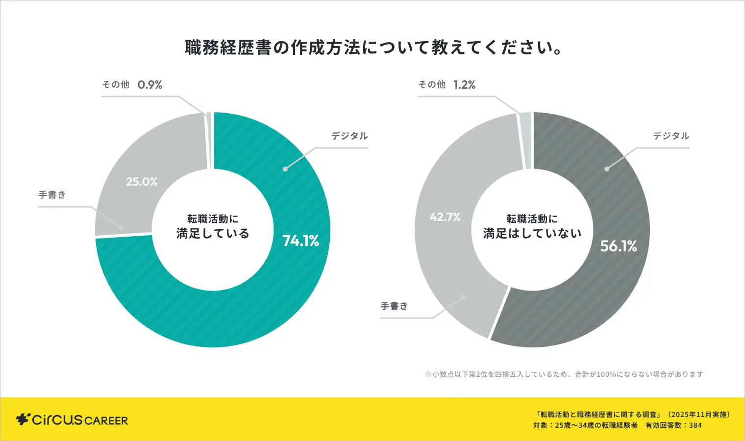 転職活動に満足している層では、WordやExcelなどのオフィスソフトや書類作成に特化したWebサービスといった「デジタルツール」で作成した方が74.1%と、大多数が効率的な作成方法を選んでいることが分かりました。