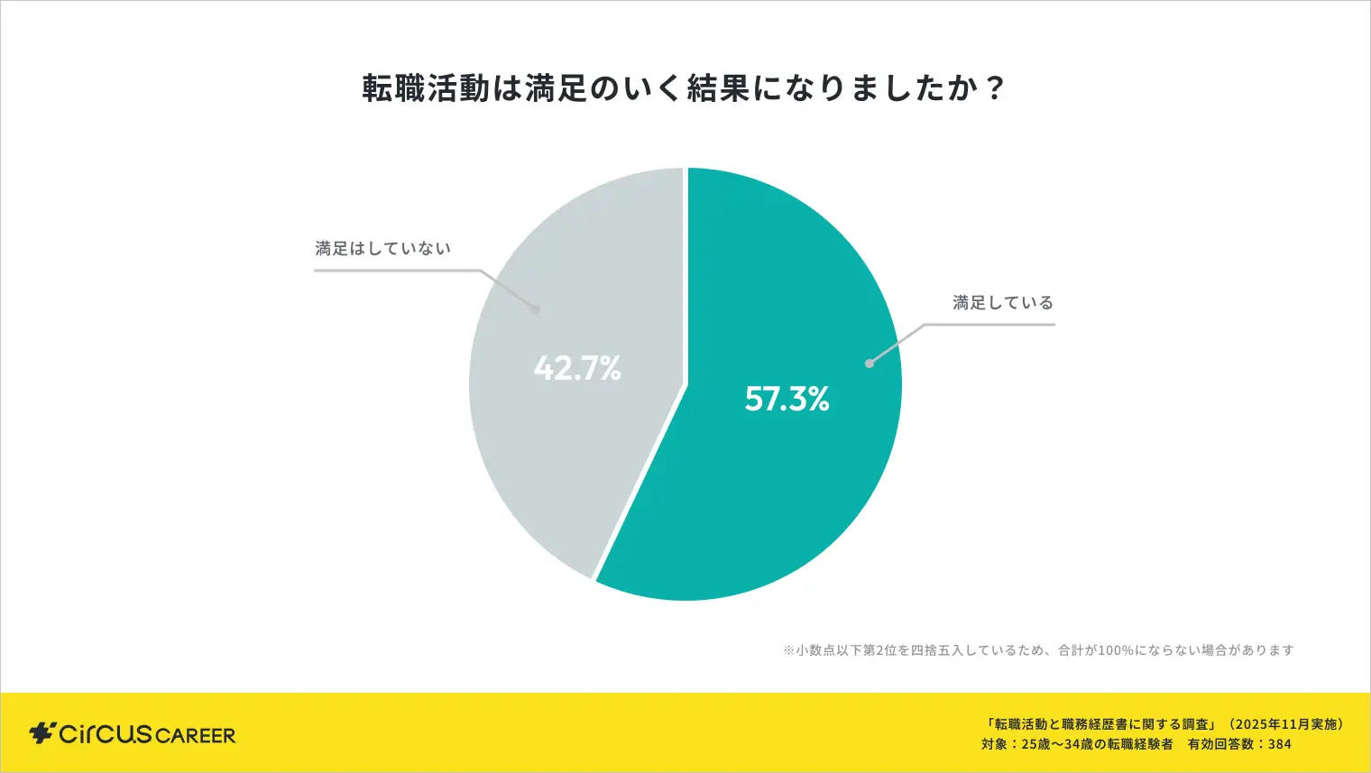 調査の結果、「満足している」と回答した人は57.3%と過半数を占めた一方で、42.7%の人は「満足はしていない」と回答しており、二極化した結果となりました。