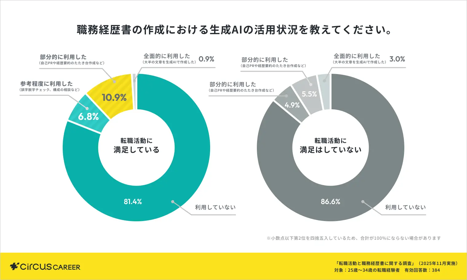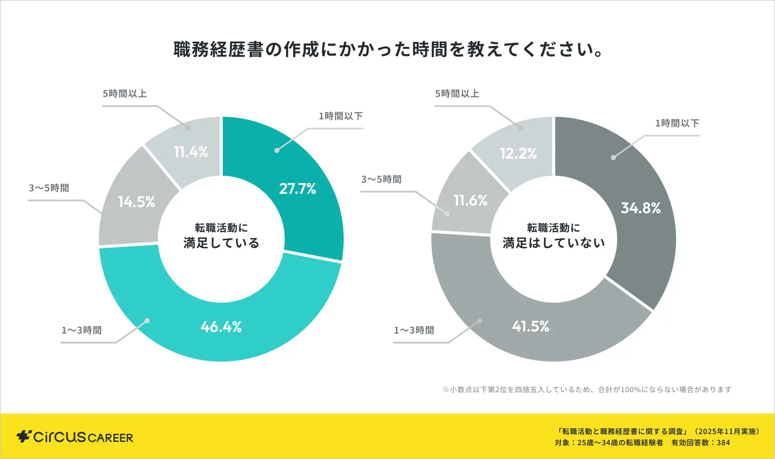 circus株式会社(所在地:東京都中央区、代表取締役:⽮部 貴志)は、転職経験のある20代~30代の男女384名に対し、職務経歴書の作成と転職活動の満足度に関する調査を実施しました。