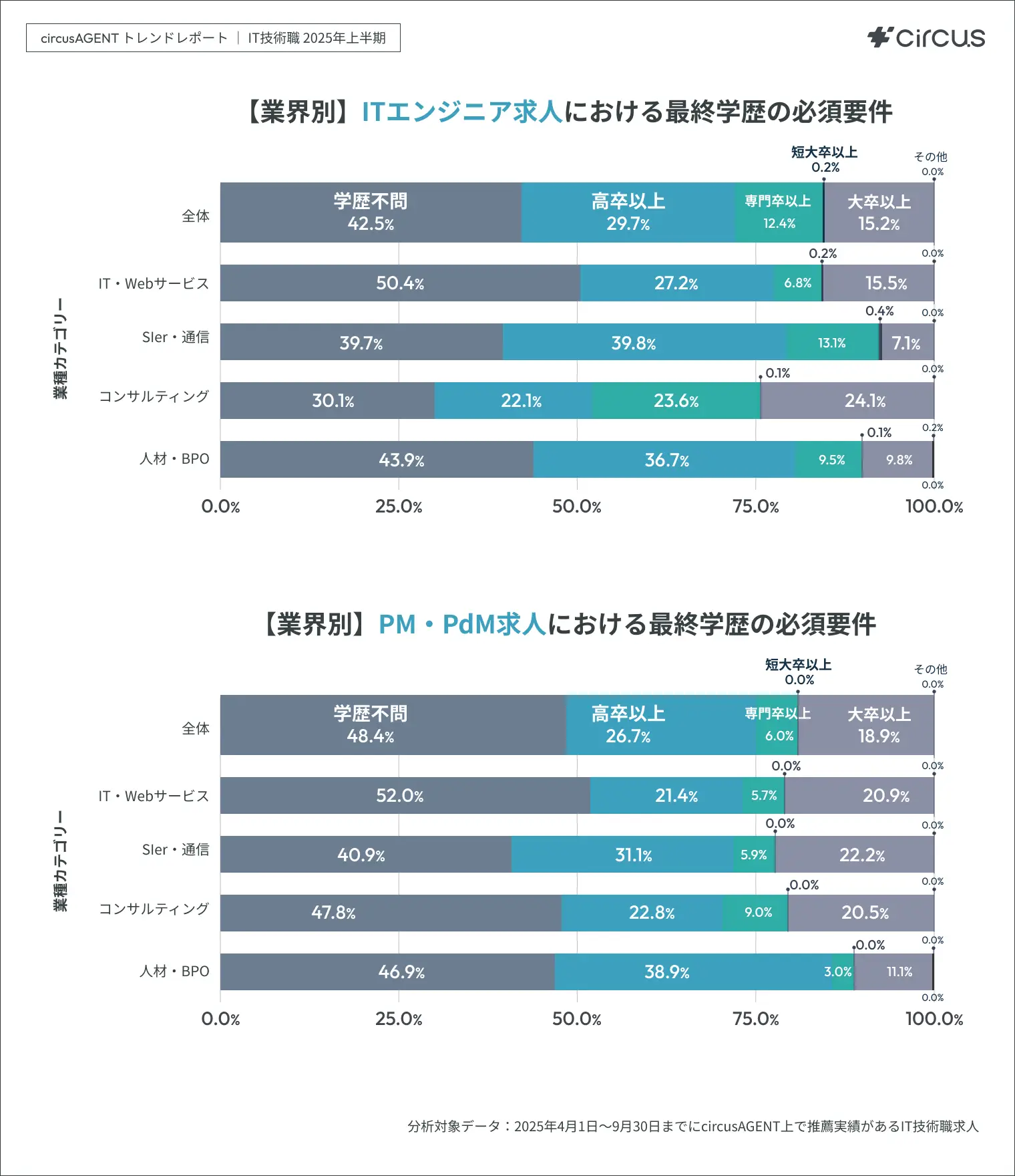 IT・Webサービス業界では、ITエンジニア職(学歴不問:50.4%)、PM・PdM職(学歴不問:52.0%)ともに学歴不問の比率が5割を超えており、学歴よりもスキルを重視する採用傾向が推察されます。