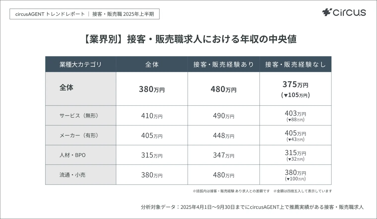 接客・販売職全体の想定年収中央値は380万円でした。経験者は480万円、未経験者は375万円となり、その差は105万円です。